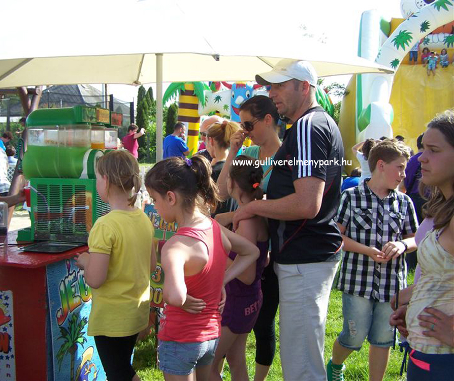 A gyerekeket játékokon kívül légvárpark területén várja frissen sütött illatozó popcorn, fagyasztót színes ital a jégkása,